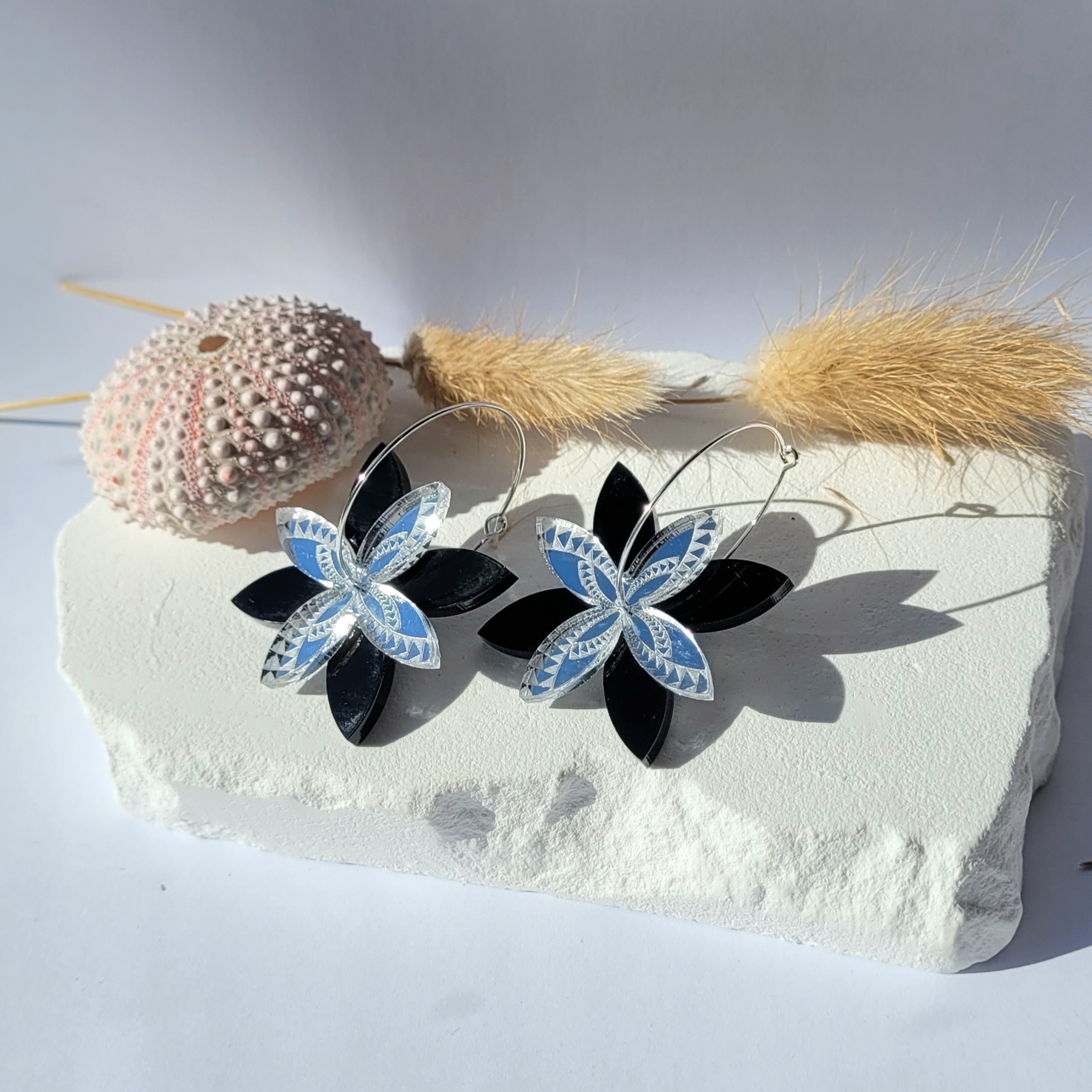 Frangipani Swirl points on a large black frangipani spinner design on 30mm hoops. Comes in: