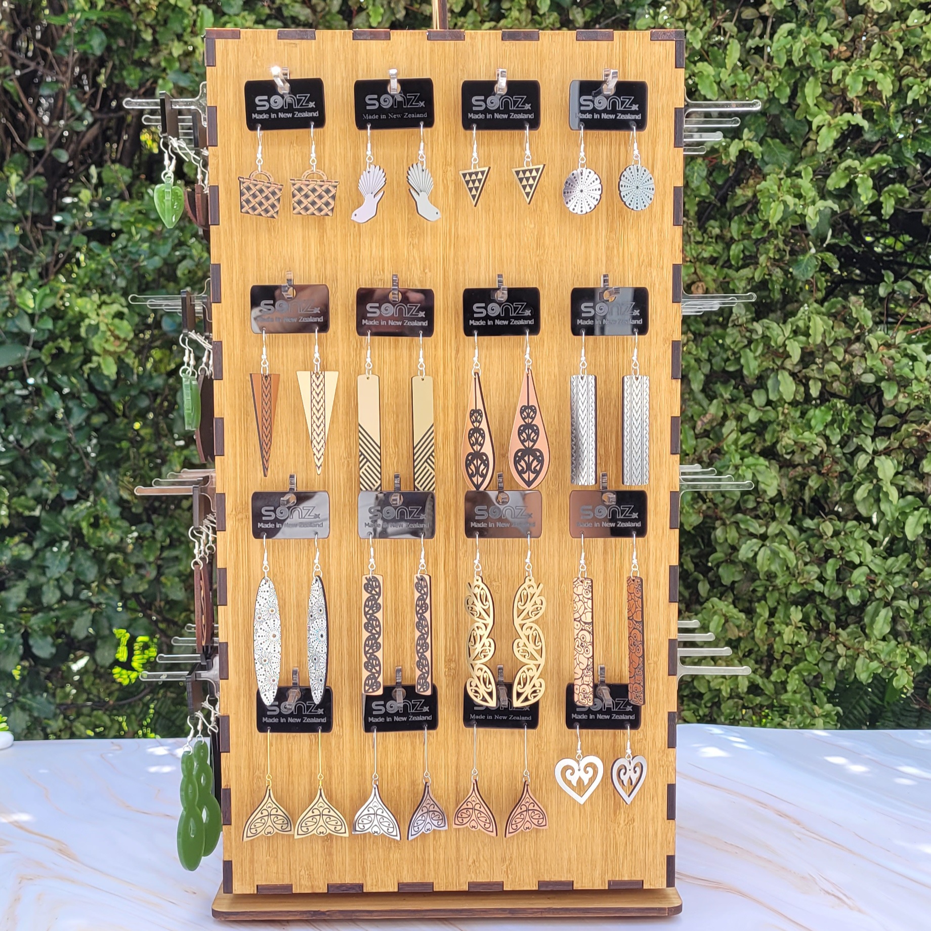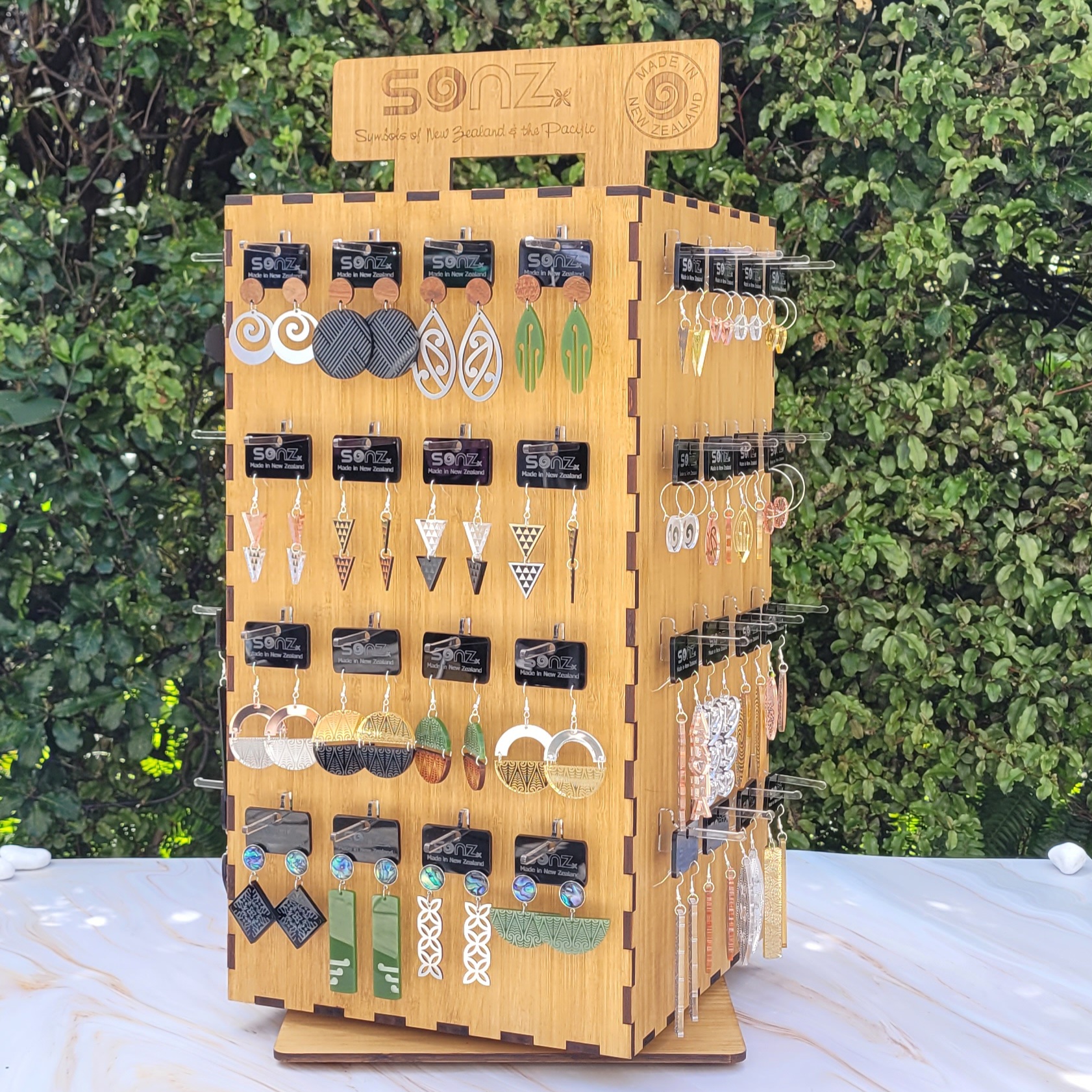 This premium SONZ stand displays 64 pairs of Kiwiana designs on a sturdy 5mm bamboo rotating peg stand. The designs come in a range of metallic, mirror, acrylic colours along with a selection of our SONZ signature range designs (these come with our SONZ black gift boxes).